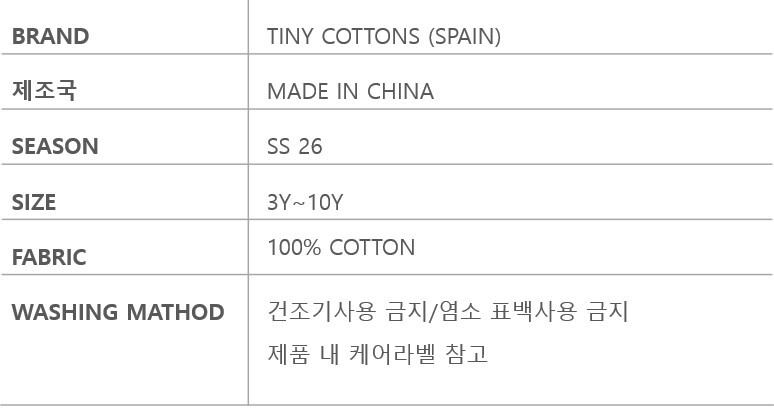 •본 사이즈 가이드는 타이니코튼 본사에서 제공한 표준 사이즈 입니다.